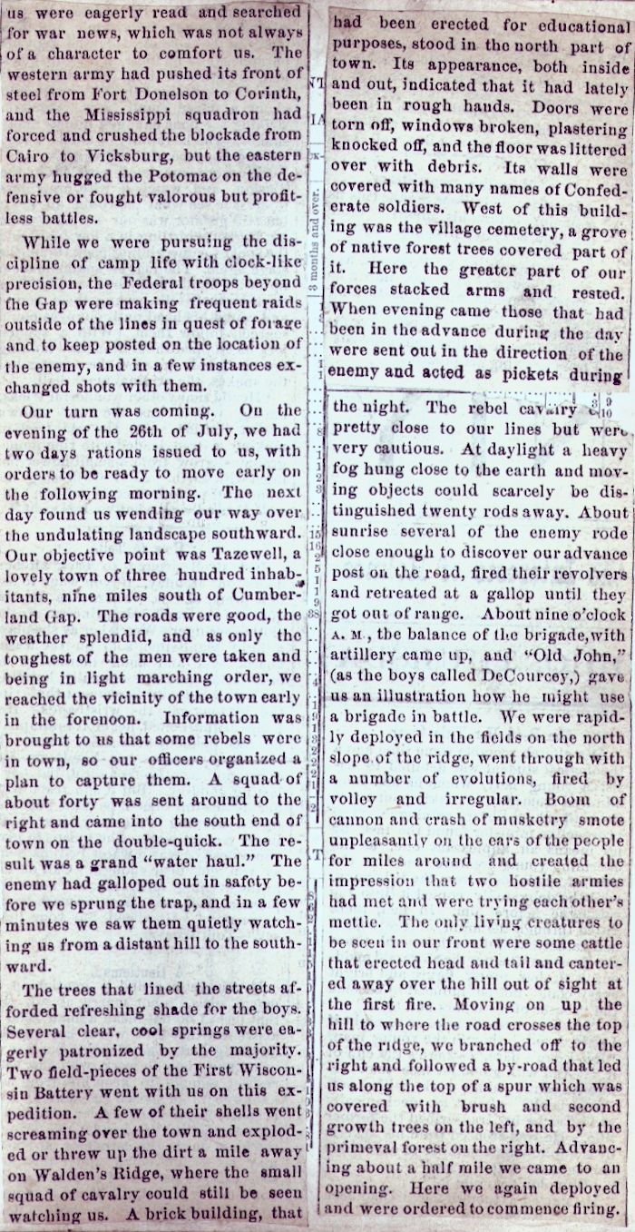 us were eagerly read and searched for war news, which was not always of a character to comfort us. The western army had pushed its front of steel from Fort Donelson to Corinth, and the Mississippi squadron had forced and crushed the blockade from Cairo to Vicksburg, but the eastern army hugged the Potomac on the defensive or fought valorous but profitless battles. While we were pursuing the discipline of camp life with clock-like precision, the Federal troops beyond the Gap were making frequent raids outside of the lines in quest of forage and to keep posted on the location of the enemy, and in a few instances exchanged shots with them. Our turn was coming. On the evening of the 26th of July, we had two days rations issued to us, with orders to be ready to move early on the following morning. The next day found us wending our way over the undulating landscape southward. Our objective point was Tazewell, a lovely town of three hundred inhabitants, nine miles south of Cumberland Gap. The roads were good, the weather splendid, and as only the toughest of the men were taken and being in light marching order, we reached the vicinity of the town early in the forenoon. Information was brought to us that some rebels were in town, so our officers organized a plan to capture them. A squad of about forty was sent around to the right and came into the south end of the town on the double-quick. The result was a grand The trees that lined the streets afforded refreshing shade for the boys. Several clear, cool springs were eagerly patronized by the majority. Two field-pieces of the First Wisconsin Battery went with us on this expedition. A few of their shells went screaming over the town and exploded or threw up the dirt a mile away on Walden's Ridge, where the small squad of cavalry could still be seen watching us. A brick building, that |