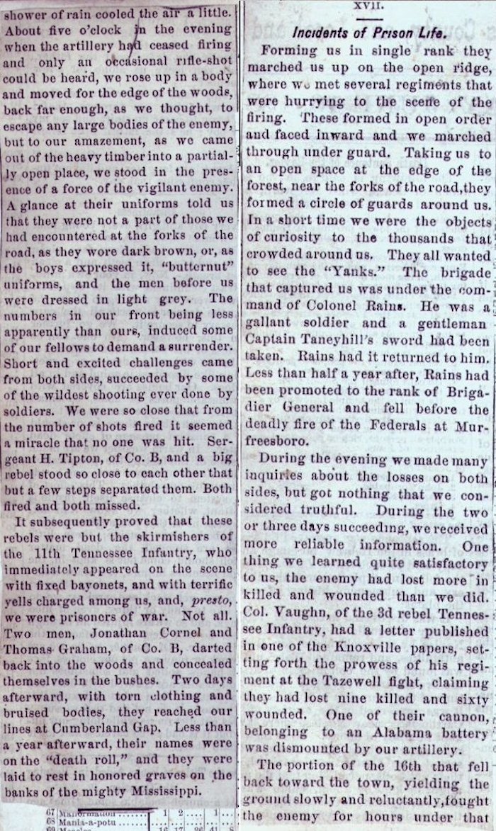shower of rain cooled the air a little. About five o'clock in the evening when the artillery had ceased firing and only an occasional rifle-shot could be heard, we rose up in a body and moved for the edge of the woods, back far enough, as we thought, to escape any large bodies of the enemy, but to our amazement, as we came out of the heavy timber into a partially open space, we stood in the presence of a force of the vigilant enemy. A glance at their uniforms told us that they were not a part of those we had encountered at the forks of the road, as they wore dark brown, or, as the boys expressed it, It subsequently proved that these rebels were but the skirmishers of the 11th Tennessee Infantry, who immediately appeared on the scene with fixed bayonets, and with terrific yells charged among us, and, presto, we were prisoners of war. Not all. Two men, Jonathan Cornel and Thomas Graham, of Co. B, darted back into the woods and concealed themselves in the bushes. Two days afterward, with torn clothing and bruised bodies, they reached our lines at Cumberland Gap. Less than a year afterward, their names were on the |