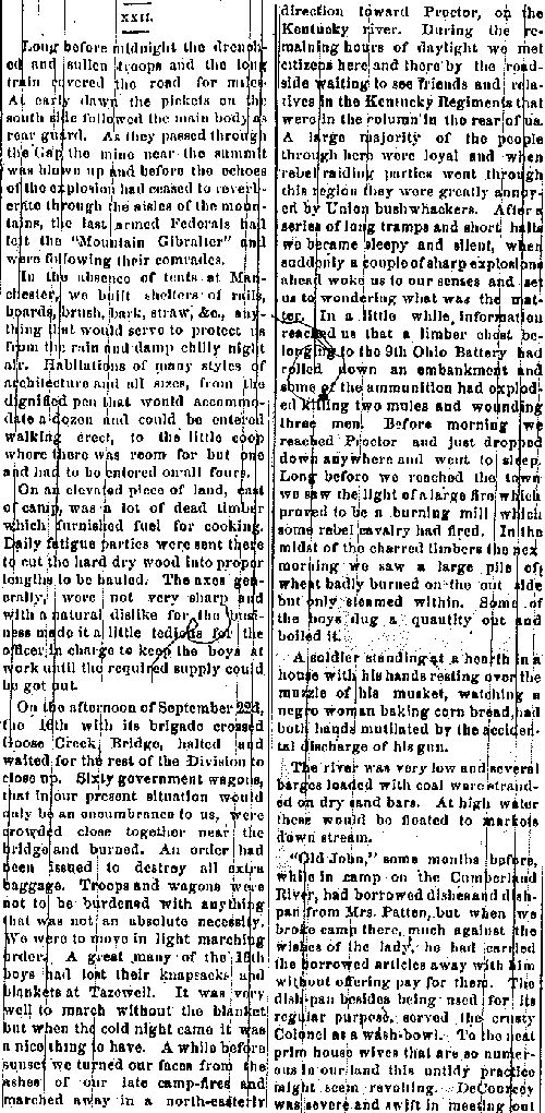 Published in Holmes County Republican XXII. Long before midnight the drenched and sullen troops and the long train covered the road for miles. At early dawn the pickets on the south side followed the main body as rear guard. As they passed through the Gap the mine near the summit was blown up and before the echoes of the explosion had ceased to reverberate through the aisles of the mountains, the last armed Federals had left the In the absence of tents at Manchester, we built shelters of rails, boards, brush, bark, straw, &c., anything that would serve to protect from the rain and damp chilly night air. Habitations of many styles of architecture and all sizes, from the dignified pen that would accommodate a dozen and could be entered walking erect, to the little coop where there was room for but one and had to be entered on all fours. On an elevated piece of land, east of camp, was a lot of dead timber which furnished fuel for cooking. Daily fatigue parties were sent there to cut the hard dry wood into proper lengths to be hauled. The axes generally, were not very sharp and with a natural dislike for the business made it a little tedious for the officer in charge to keep the boys at work until the required supply could be got to. On the afternoon of September 22d, the 16th with its brigade crossed Goose Creek Bridge, halted and waited for the rest of the Division to close up. Sixty government wagons, that in our present situation would only be an encumbrance to us, were crowded close together near the bridge and burned. An order had been issued to destroy all extra baggage. Troops and wagons were not to be burdened with anything that was not an absolute necessity. We were to move in light marching order. A great many of the 16th boys had lost their knapsacks and blankets at Tazewell. It was very well to march without the blanket but when the cold night came it was a nice thing to have. A while before sunset we turned our faces from the ashes of our late camp-fires and marched away in a north-easterly |