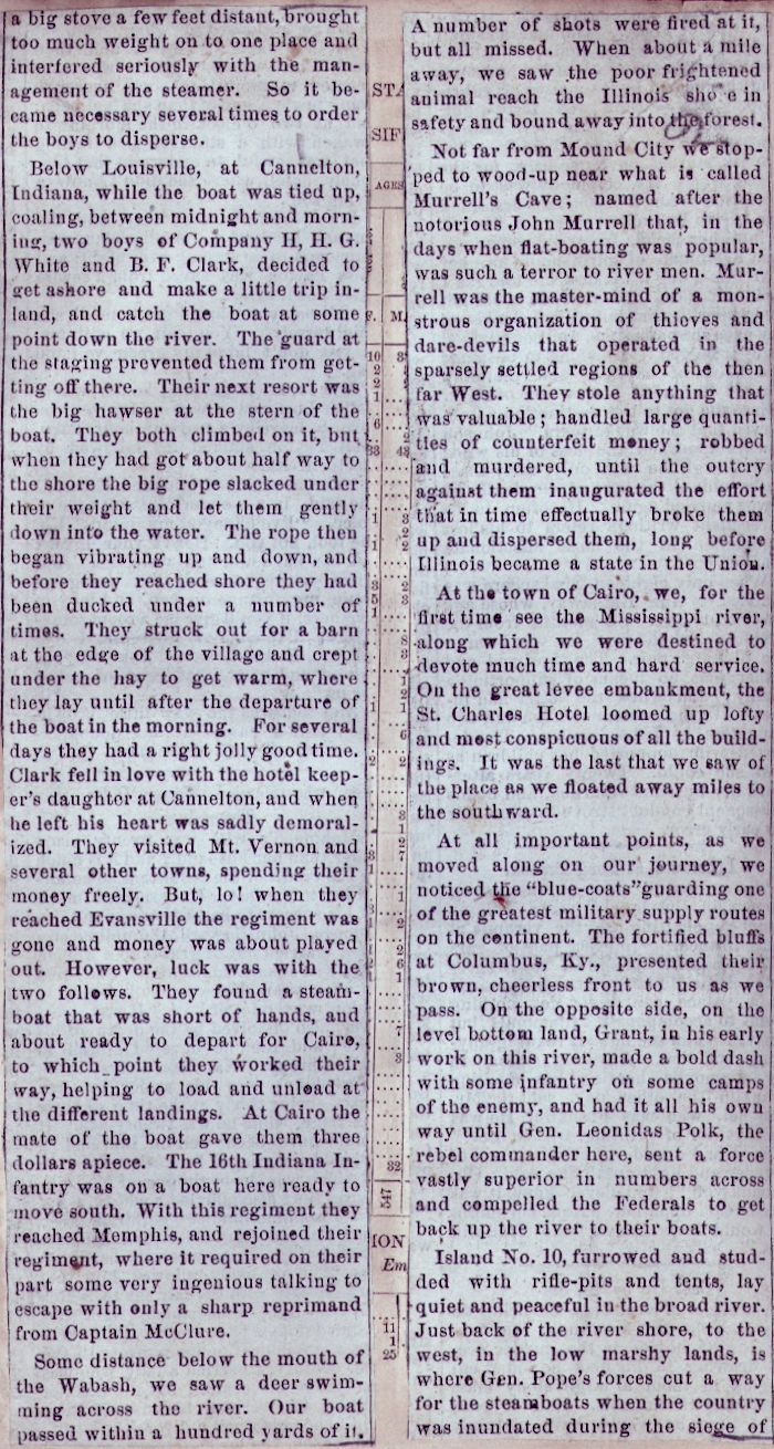 a big stove a few feet distant, brought too much weight on to one place and interfered seriously with the management of the steamer. So it became necessary several times to order the boys to disperse. Below Louisville, at Cannelton, Indiana, while the boat was tied up, coaling, between midnight and morning, two boys of Company H, H.G. White and B.F. Clark, decided to get ashore and make a little trip inland, and catch the boat at some point down the river. The guard at the staging prevented them from getting off there. Their next resort was the big hawser at the stern of the boat. They both climbed on it, but when they had got about half way to the shore the big rope slacked under their weight and let them gently down into the water. The rope then began vibrating up and down, and before they reached shore they had been ducked under a number of times. They struck out for a barn at the edge of the village and crept under the hay to get warm, where they lay until after the departure of the boat in the morning. For several days they had a right jolly good time. Clark fell in love with the hotel keeper's daughter at Cannelton, and when he left his heart was sadly demoralized. They visited Mt. Vernon and several other towns, spending their money freely. But, lo! When they reached Evansville the regiment was gone and money was about played out. However, luck was with the two fellows. They found a steamboat that was short of hands, and about ready to depart for Cairo, to which point they worked their way, helping to load and unload at the different landings. At Cairo the mate of the boat gave them three dollars apiece. The 16th Indiana Infantry was on a boat here ready to move south. With this regiment they reached Memphis, and rejoined their regiment, where it required on their part some very ingenious talking to escape with only a sharp reprimand from Captain McClure. Some distance below the mouth of the Wabash, we saw a deer swimming across the river. Our boat passed within a hundred yards of it. |
