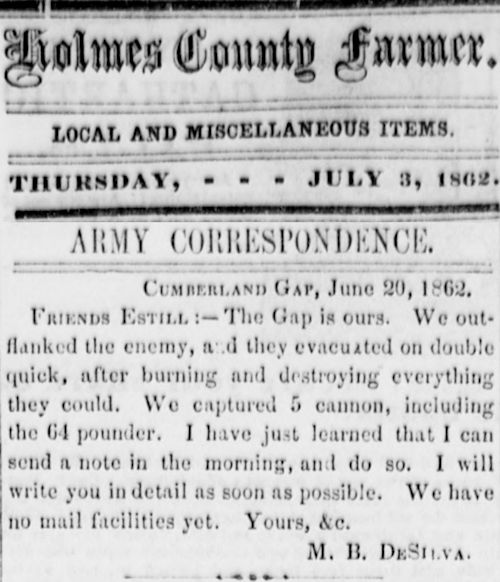 ARMY CORRESPONDENCE. CUMBERLAND GAP, June 20, 1862. FRIENDS ESTILL:--The Gap is ours. We outflanked the enemy, and they evacuated on double quick after burning and destroying everything they could. We captured 5 cannon, including the 64 pounder. I have just learned that I can send a note in the morning, and do so. I will write you in detail as soon as possible. We have no mail facilities yet. Yours, &c. M. B. DESILVA. |