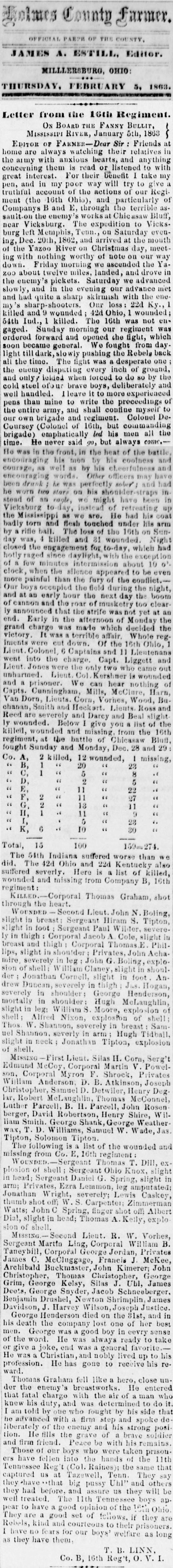 EDITOR OF FARMER--Dear Sir : Friends at home are always watching their relatives in the army with anxious hearts, and anything concerning them is read or listened to with great interest. For their benefit I take my pen, and in my poor way will try to give a truthful account of the actions of our Regiment (the 16th Ohio), and particularly of Companys B and E, through the terrible assault on the enemy's works at Chicasaw Bluff, near Vicksburg. The expedition to Vicksburg left Memphis, Tenn., on Saturday evening, Dec. 20th, 1862, and arrived at the mouth of the Yazoo River on Christmas day, meeting with nothing worth of note on our way down. Friday morning we ascended the Yazoo about twelve miles, landed, and drove in the enemy's pickets. Saturday we advanced slowly, and in the evening our advance met and had quite a sharp skirmish with the enemy's sharp-shooters. Our loss: 22d Ky., 1 killed and 9 wounded; 42d Ohio, 1 wounded; 54th Ind., 1 killed. The 16th was not engaged. Sunday morning our regiment was ordered forward and opened the fight, which soon became general. We fought from daylight till dark, slowly pushing the Rebels back all the time. The fight was a desperate one; the enemy disputing every inch of ground, and only yielded when forced to do so by the cold steel of our brave boys, deliberately and well handled. I leave it to more experienced pens than mine to write the proceedings of the entire army, and shall confine myself to our own brigade and regiment. Colonel DeCoursey (Colonel of 16th, but commanding brigade) emphatically led his men all the time. He never said go; but always come. He was in front, in the heat of the battle, encouraging his men by his coolness and courage, as well as by his cheerfulness and encouraging words. Other officers may have been drunk; he was perfectly sober; and had he worn two stars, on his shoulder-straps in stead of an eagle, we might have been in Vicksburg today, instead of retreating up the Mississippi as we are. He had his coat badly torn and flesh touched under his arm by a rifle ball. The loss of the 16th on Sunday was, 4 killed and 81 wounded. Night closed the engagement for to-day, which had hotly raged since daylight, with the exception of a few minutes intermission about 10 o'clock, when the silence appeared to be even more painful than the fury of the conflict. Our boys occupied the field during the night, and at an early hour the next day the boom of canon and the roar of musketry too clearly announced that the strife was not yet at an end. Early in the afternoon of Monday the grand charge was made which decided the victory. It was a terrible affair. Whole regiments were cut down. Of the 16th Ohio, 1 Lieut. Colonel, 6 Captains and 11 Lieutenants went into the charge. Capt. Liggett and Lieut. Jones were the only two who came out unharmed. Lieut. Col. Kershner is wounded and a prisoner. We can hear nothing of Capts. Cunningham, Mills, McClure, Harn, Van Dorn, Lieut. Corn, Vorhes, Wood, Buchanan, Smith and Heckart. Lieuts. Ross and Reed are severely and Darcy and Beal slightly wounded. Below I give you a list of the killed, wounded and missing, from the 16th regiment, at the battle of Chicasaw Bluff, fought Sunday and Monday, Dec. 28 and 29: