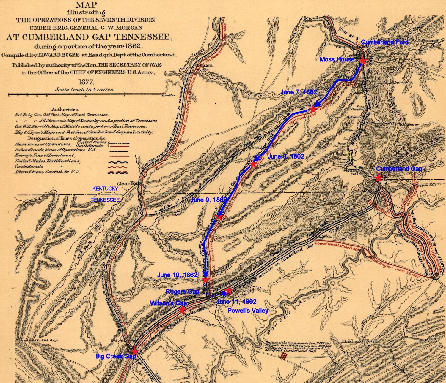 The 16th Ohio, along with Col. DeCourcey's and Gen. Baird's brigades, made the incredibly difficult ascent up Roger's Gap on June 11 and down into Powell's Valley on the south side. Powell's Valley now offered a straight route to the northeast directly to the southern entrance to Cumberland Gap, still held by the Confederates. Since there was no significant attempt by the Confederates to engage the advancing Union forces, it is likely the enemy had no idea that the majority of Gen. George W. Morgan's forces had left Cumberland Ford, circled around and were now within striking distance of The Gap just 20 miles to the northeast with nothing in the way to stop them. Cpl. Wolbach: