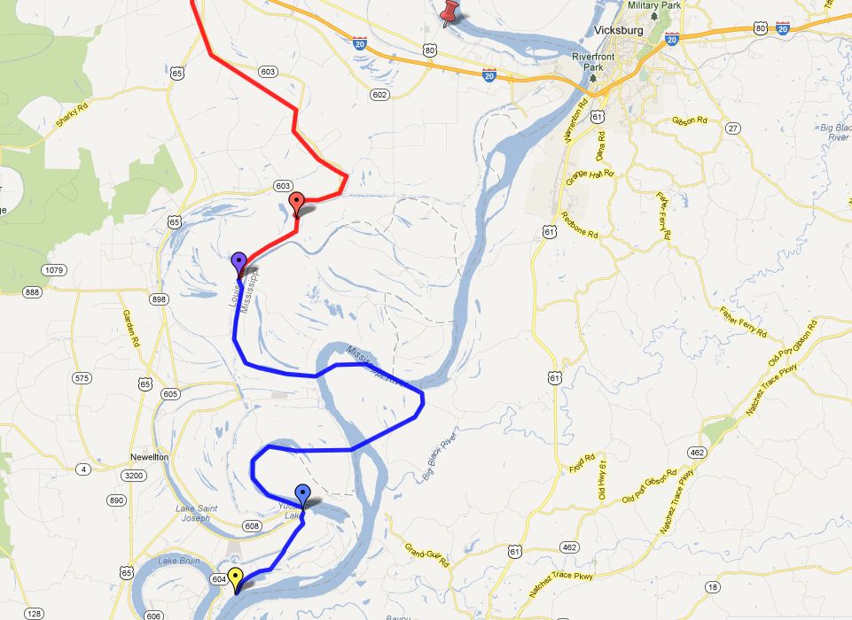 Note: Route shown is approximated along Mississippi River bed as it was in 1863.