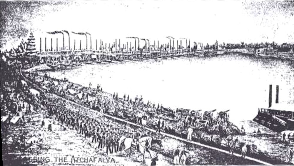 Below is a sketch of the crossing of the Atchafalaya River at Simmesport, Louisiana, May 20, 1864, by Gen. Banks' troops, over the steamboat bridge, built by engineer Lt. Col. Joseph Bailey. This sketch by John Needham Bellchamber of Company C, 119th Illinois Infantry and held by the Illinois State Historical Society, Springfield, Illinois.